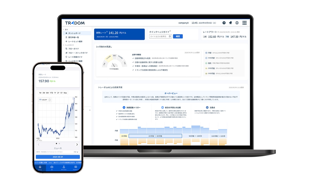 「トレーダム為替ソリューション」は、国内初のAI為替リスク管理システム。海外取引のある企業が抱える為替に関するお悩みを解決するサービスをご提供。